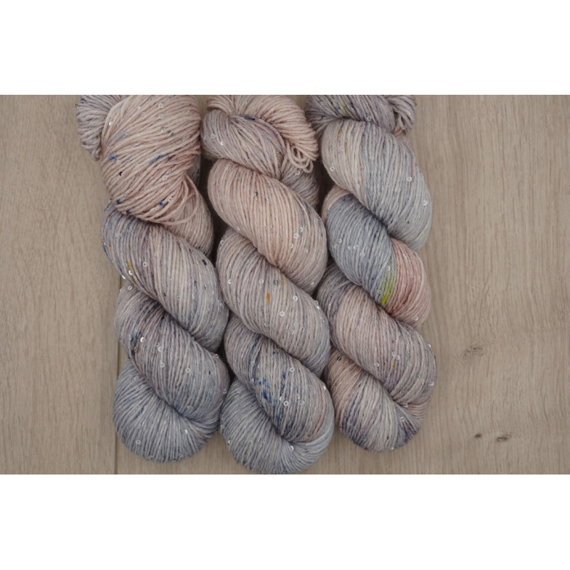 Die Wolle ist ein kuschelig, weiches Merinogarn (Merino extrafine) mit glitzernden Pailletten und mit superwash Behandlung. Sie ist beim Stricken wunderbar weich und perfekt geeignet für glitzernde Tücher, Pullover, Strickjacken und andere Accessoires. Sie ist bei 30 Grad waschmaschinengeeignet. Die Wolle stammt aus mulesingfreier Haltung.