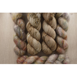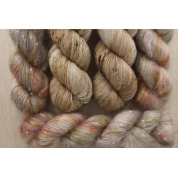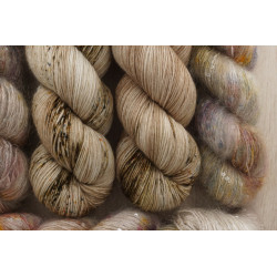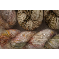 und 150g von: 34% Kid Mohair/ 11% Seide/ 41 Polyamid/ 14% Polyesther , 390 m/ 100 g; € 49,80/ 100 g