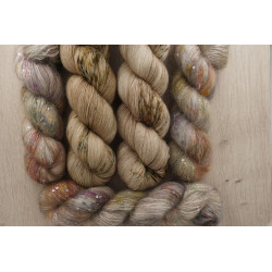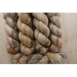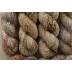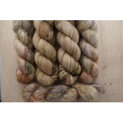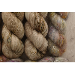 und 150g von: 34% Kid Mohair/ 11% Seide/ 41 Polyamid/ 14% Polyesther , 390 m/ 100 g; € 49,80/ 100 g