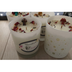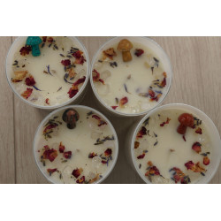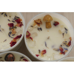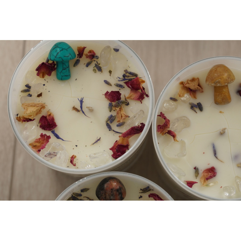 Mit einem Edelsteinpilz, klaren Bergkristallen und echten getrockneten Rosen- und Lavendelblüten.